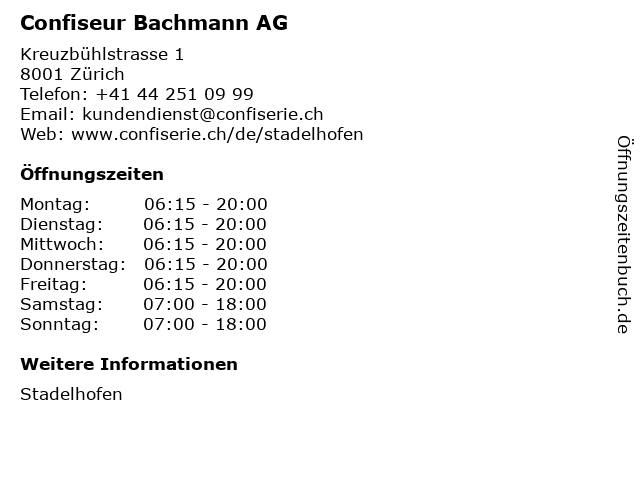 | Öffnungszeiten Confiseur Bachmann AG in Zürich anzeigen | |