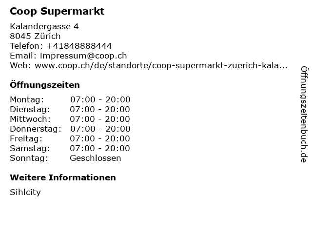 | Öffnungszeiten Coop Supermarkt in Zürich anzeigen | |