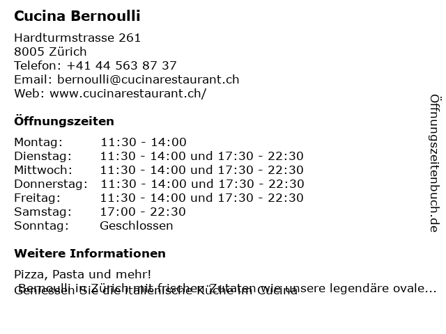 | Öffnungszeiten Cucina Bernoulli in Zürich anzeigen | |