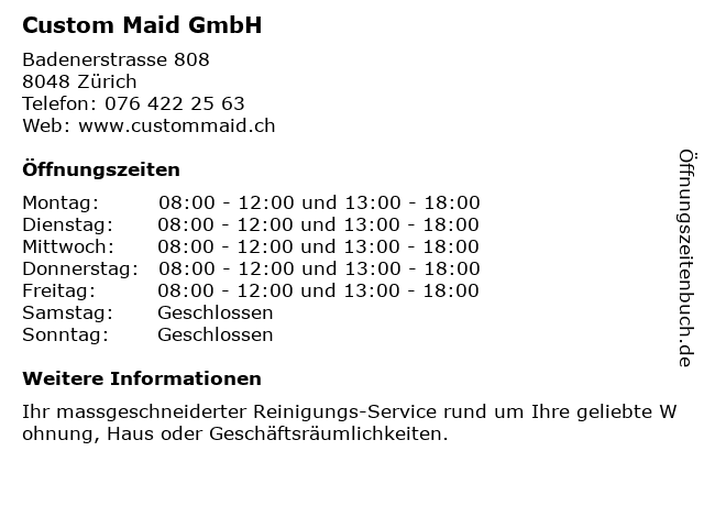 | Öffnungszeiten Custom Maid GmbH in Zürich anzeigen | |