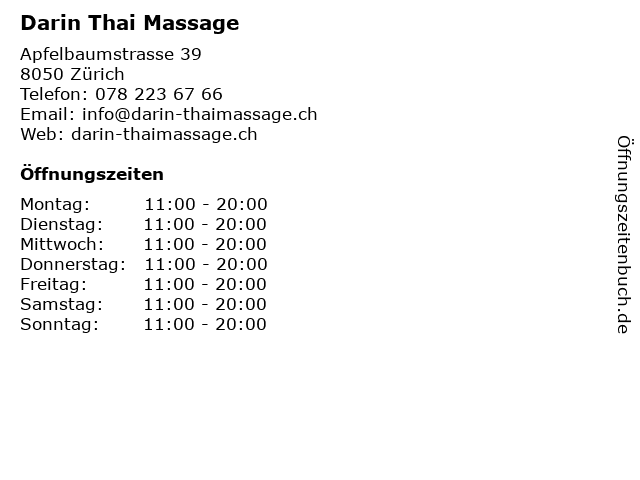 | Öffnungszeiten Darin Thai Massage in Zürich anzeigen | |