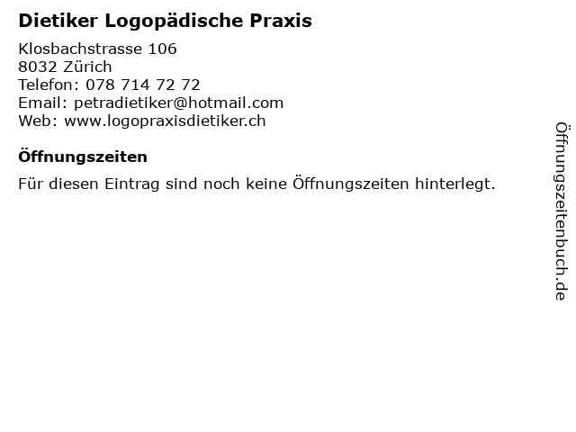 | Öffnungszeiten Dietiker Logopädische Praxis in Zürich anzeigen | |