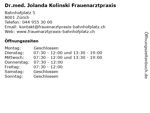 1 Gyn Bahnhofstrasse Dr.med. Carlo Fonzini, Dr.med. Fabrice Buff Frauenarztpraxis (Entfernung: 0,03 km) Bahnhofstrasse 106, 8001 Zürich 6 |