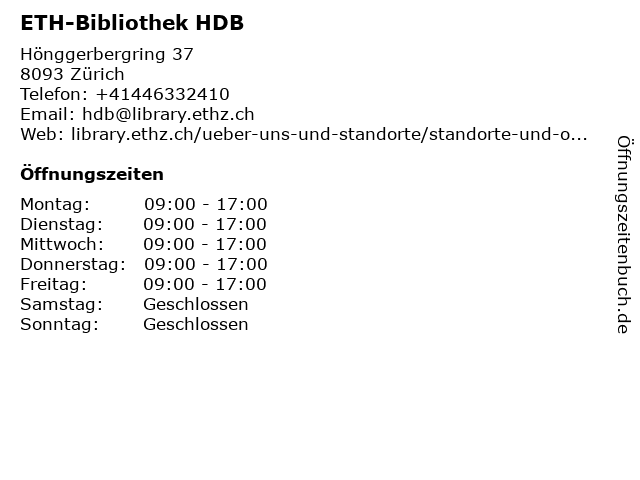 | Öffnungszeiten ETH-Bibliothek HDB in Zürich anzeigen | |