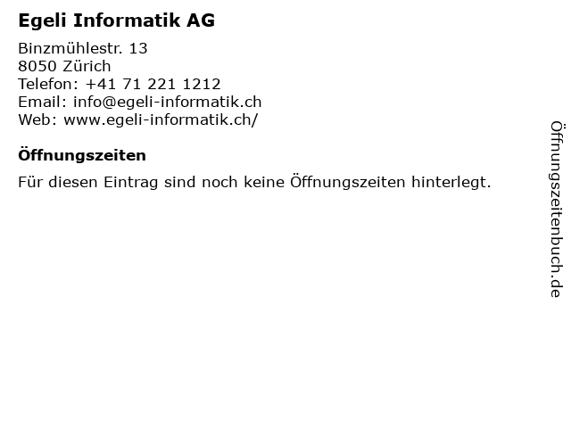 | Öffnungszeiten Egeli Informatik AG in Zürich anzeigen | |