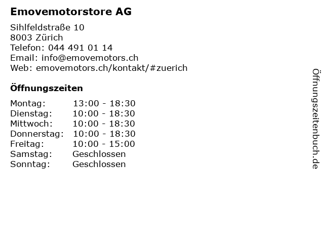 | Öffnungszeiten Emovemotorstore AG in Zürich anzeigen | |