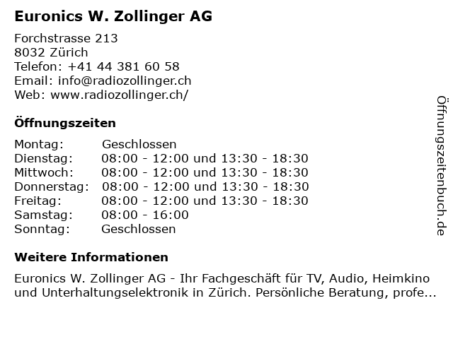 | Öffnungszeiten Euronics W. Zollinger AG in Zürich anzeigen | |