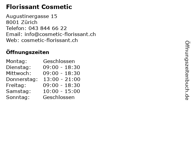 | Öffnungszeiten Florissant Cosmetic in Zürich anzeigen | |