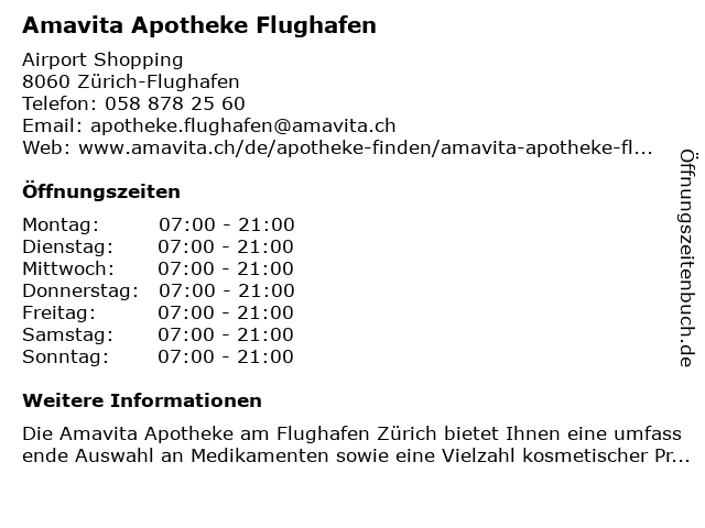 6 Amavita (Körper & Gesundheit) - Flughafen Zürich (Entfernung: 1,08 km) Flughafenstraße 1, 8058 Zürich-Flughafen |
