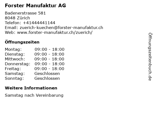 | Öffnungszeiten Forster Manufaktur AG in Zürich anzeigen | |