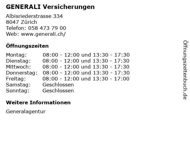 | Öffnungszeiten GENERALI Versicherungen in Zürich anzeigen | |