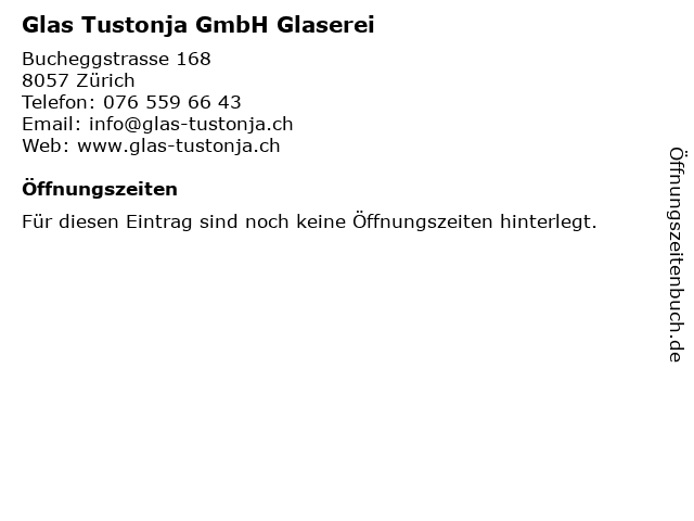 | Öffnungszeiten Glas Tustonja GmbH Glaserei in Zürich anzeigen | |