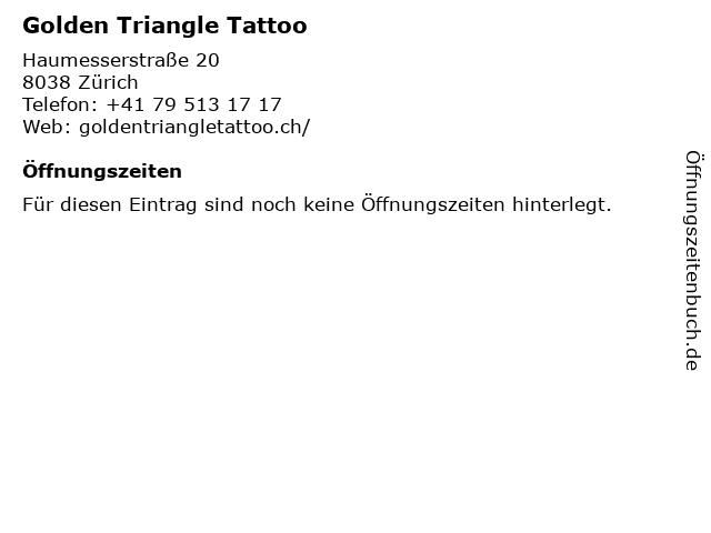 | Öffnungszeiten Golden Triangle Tattoo in Zürich anzeigen | |