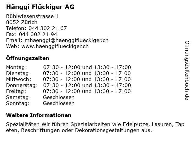 | Öffnungszeiten Hänggi Flückiger AG in Zürich anzeigen | |