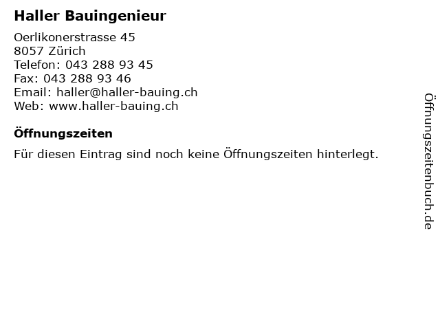| Öffnungszeiten Haller Bauingenieur in Zürich anzeigen | |