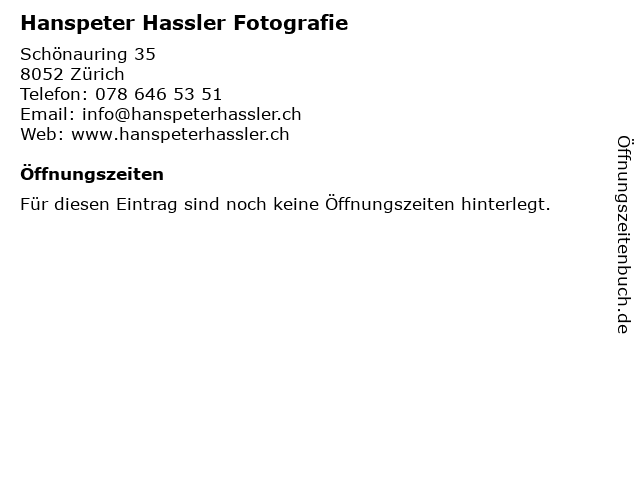 | Öffnungszeiten Hanspeter Hassler Fotografie in Zürich anzeigen | |