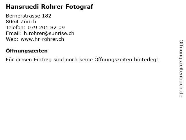 | Öffnungszeiten Hansruedi Rohrer Fotograf in Zürich anzeigen | |