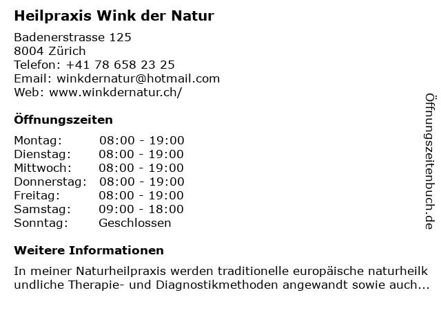 | Öffnungszeiten Heilpraxis Wink der Natur in Zürich anzeigen | |