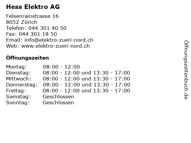 | Öffnungszeiten Hess Elektro AG in Zürich anzeigen | |
