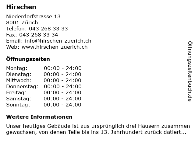| Öffnungszeiten Hirschen in Zürich anzeigen | |