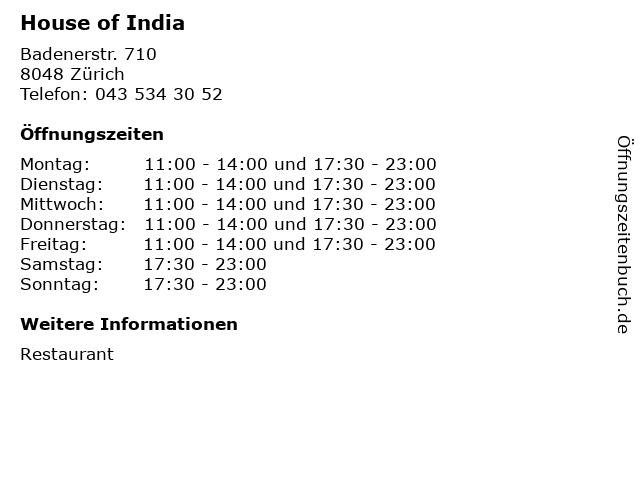 | Öffnungszeiten House of India in Zürich anzeigen | |