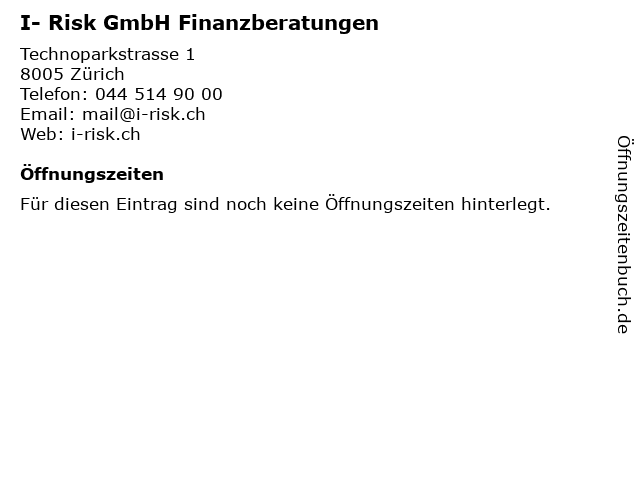 | Öffnungszeiten I- Risk GmbH Finanzberatungen in Zürich anzeigen | |