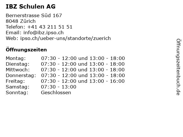 | Öffnungszeiten IBZ Schulen AG in Zürich anzeigen | |
