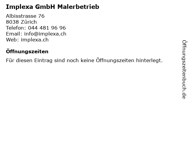 | Öffnungszeiten Implexa GmbH Malerbetrieb in Zürich anzeigen | |