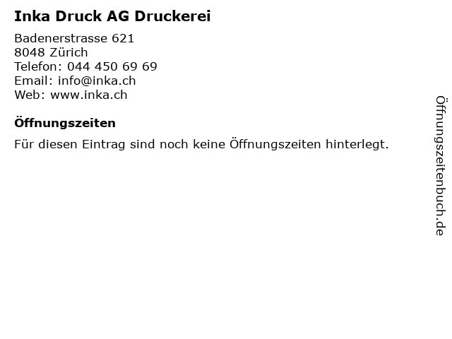 | Öffnungszeiten Inka Druck AG Druckerei in Zürich anzeigen | |