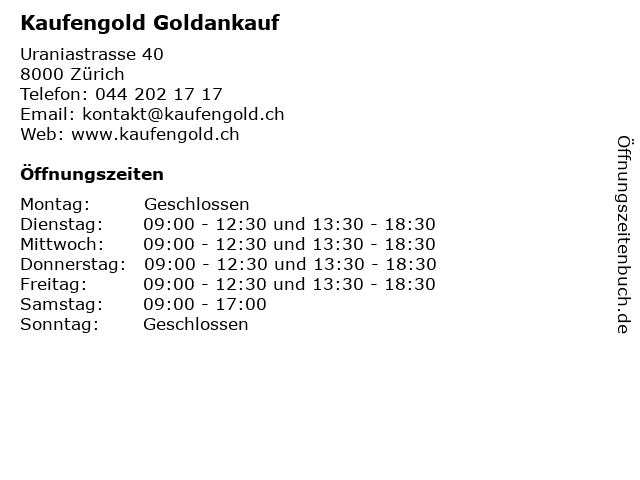 | Öffnungszeiten Kaufengold Goldankauf in Zürich anzeigen | |