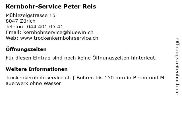 | Öffnungszeiten Kernbohr-Service Peter Reis in Zürich anzeigen | |