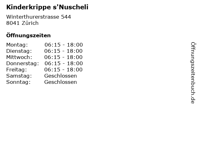 | Öffnungszeiten Kinderkrippe s'Nuscheli in Zürich anzeigen | |