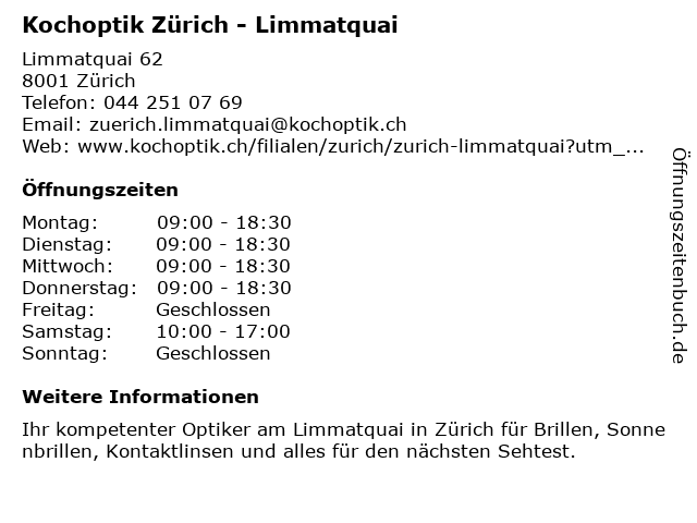 | Öffnungszeiten Kochoptik Zürich - Limmatquai in Zürich anzeigen | |