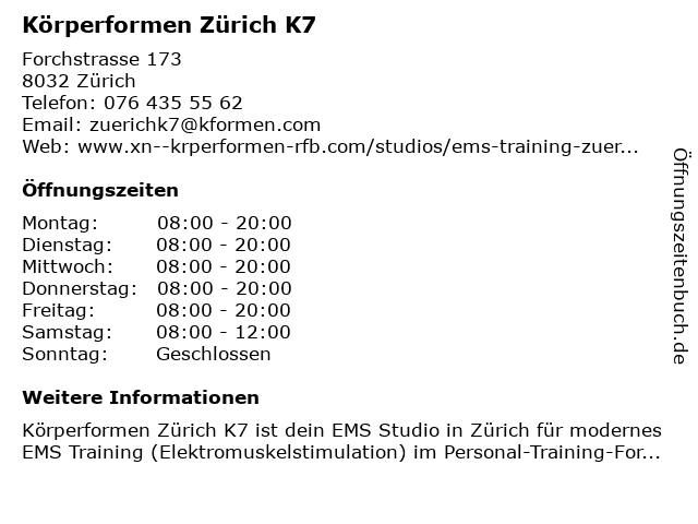 | Öffnungszeiten Körperformen Zürich K7 in Zürich anzeigen | |