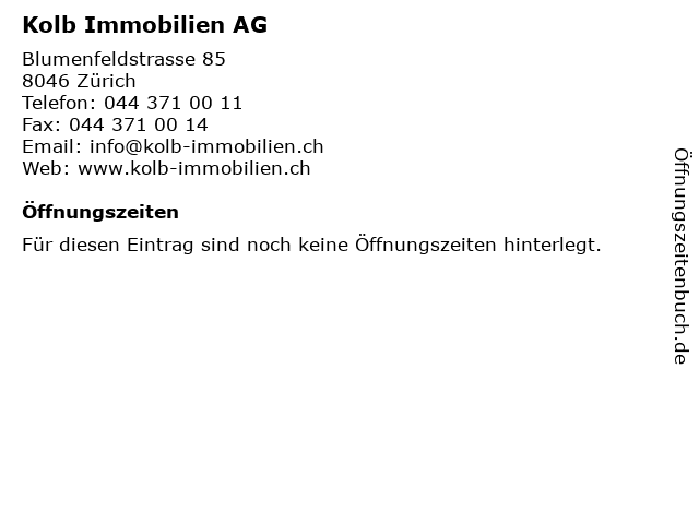 | Öffnungszeiten Kolb Immobilien AG in Zürich anzeigen | |