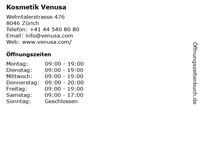 | Öffnungszeiten Kosmetik Venusa in Zürich anzeigen | |