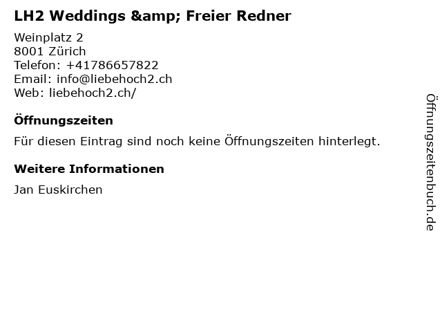 | Öffnungszeiten LH2 Weddings & Freier Redner in Zürich anzeigen | |