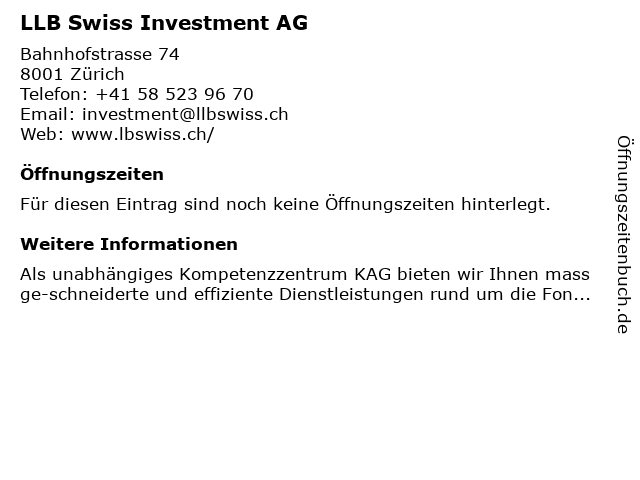 | Öffnungszeiten LLB Swiss Investment AG in Zürich anzeigen | |