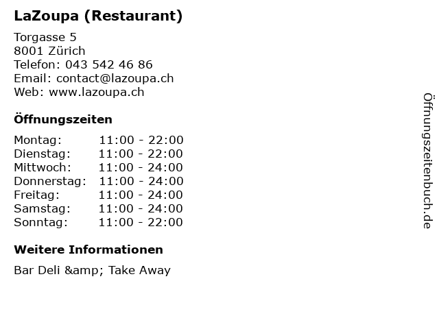 | Öffnungszeiten LaZoupa (Restaurant) in Zürich anzeigen | |