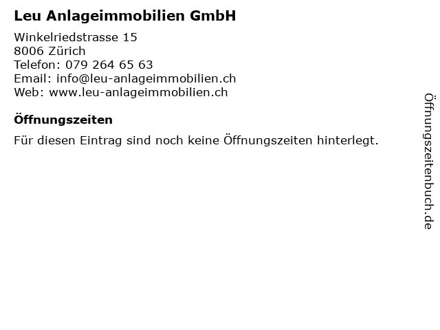 | Öffnungszeiten Leu Anlageimmobilien GmbH in Zürich anzeigen | |