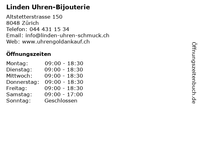 | Öffnungszeiten Linden Uhren-Bijouterie in Zürich anzeigen | |