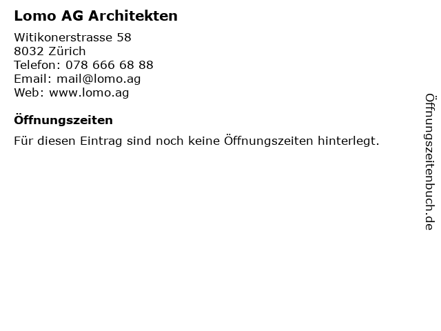 | Öffnungszeiten Lomo AG Architekten in Zürich anzeigen | |