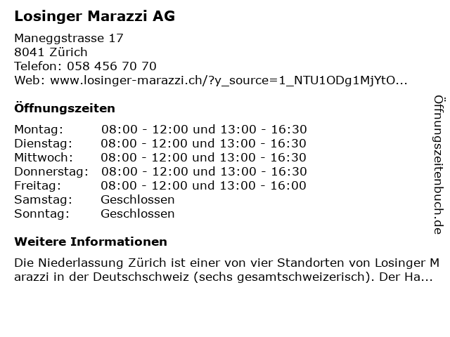 | Öffnungszeiten Losinger Marazzi AG in Zürich anzeigen | |