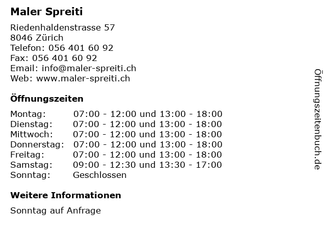 | Öffnungszeiten Maler Spreiti in Zürich anzeigen | |