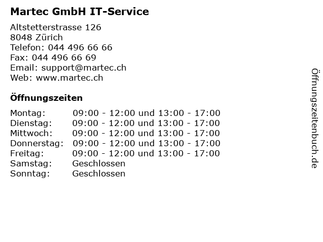 | Öffnungszeiten Martec GmbH IT-Service in Zürich anzeigen | |