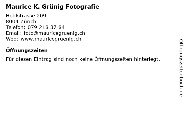 | Öffnungszeiten Maurice K. Grünig Fotografie in Zürich anzeigen | |
