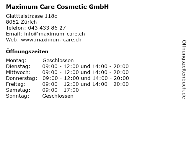 | Öffnungszeiten Maximum Care Cosmetic GmbH in Zürich anzeigen | |