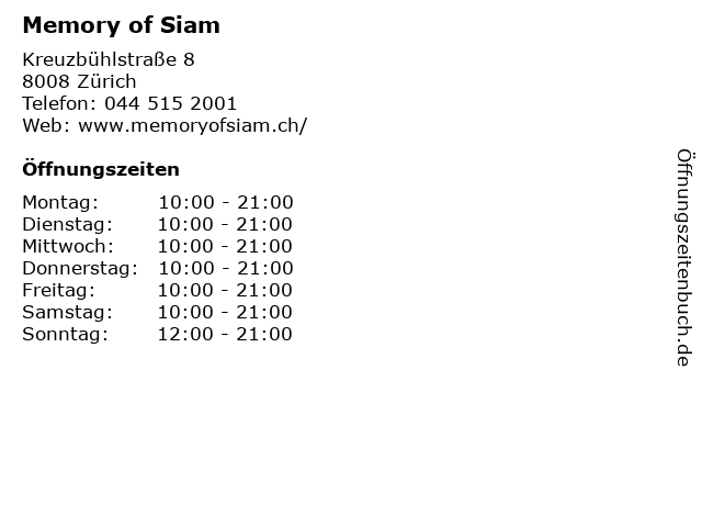 | Öffnungszeiten Memory of Siam in Zürich anzeigen | |