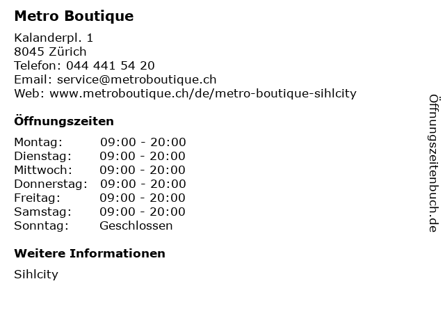 | Öffnungszeiten Metro Boutique in Zürich anzeigen | |
