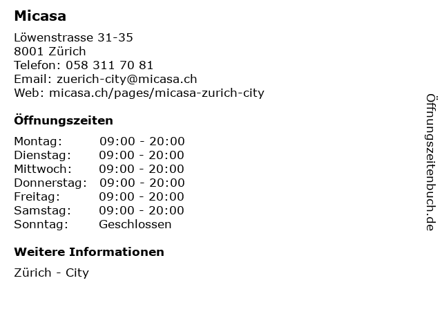 | Öffnungszeiten Micasa in Zürich anzeigen | |